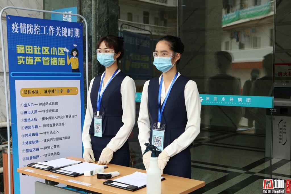 把好安全關(guān)。水務(wù)集團(tuán)工作人員正對(duì)出入萬(wàn)德大廈的人進(jìn)行登記和體溫檢測(cè)。