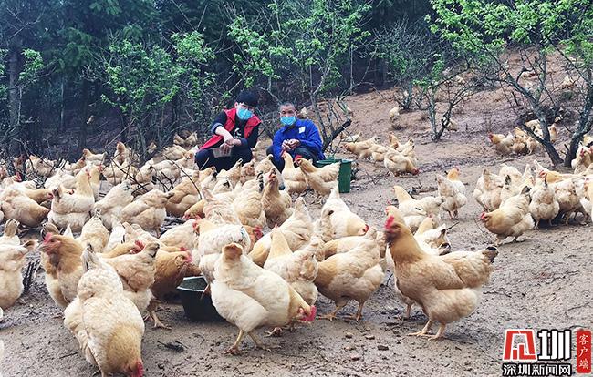 3月11日的清晨,66歲的王子平頂著薄霧,在田西村百香雞孵化養(yǎng)殖基地中,撒下了喂養(yǎng)雞群的百香果玉米等混合飼料。這些雞,已經(jīng)在田西村山坡上散養(yǎng)了超過240天,也就是扶貧產(chǎn)業(yè)農(nóng)產(chǎn)品“百香雞”。這是深圳南山對口扶貧連平縣百香雞孵化養(yǎng)殖基地的一個勞作場景。