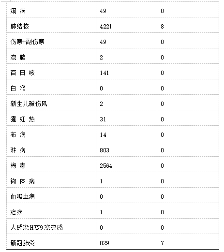 其中,甲類(lèi)傳染病無(wú)報(bào)告,乙類(lèi)傳染病甲類(lèi)管理的新冠肺炎報(bào)告病例829例。乙類(lèi)除傳染性非典型肺炎、脊髓灰質(zhì)炎、人感染高致病性禽流感、狂犬病、炭疽、乙腦、白喉、血吸蟲(chóng)病、人感染H7N9禽流感無(wú)發(fā)病、死亡報(bào)告外,其余18種傳染病均有病例報(bào)告。