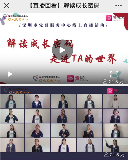 見圳客戶端、深圳新聞網(wǎng) 2020年3月19日訊(記者 陳彬) 3月15日下午,中共深圳市委組織部和深圳廣播電影電視集團(tuán)聯(lián)合在壹深圳客戶端推出深圳市黨群服務(wù)中心線上直播活動(dòng),播出深圳市第二實(shí)驗(yàn)學(xué)校花語(yǔ)合唱團(tuán)“云合唱”作品《奉獻(xiàn)》,截止3月18日,線上點(diǎn)擊量達(dá)到21.5萬(wàn) 。