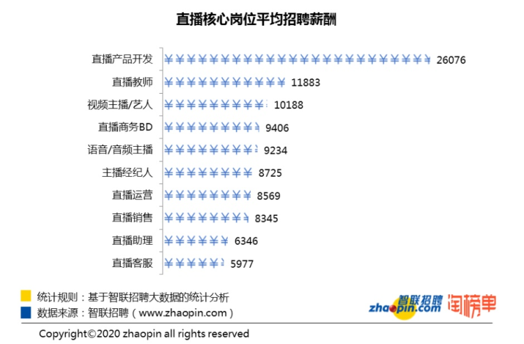 知識(shí)、技術(shù)密集型和資源密集型的崗位往往工資更高,這對(duì)于直播人才也同樣適用。細(xì)分來看,負(fù)責(zé)直播界面設(shè)計(jì)、開發(fā)、測試、運(yùn)維等多階段把控的直播產(chǎn)品開發(fā)崗位以26076元/月的高薪位居薪酬第一。此外,直播教師的平均薪資達(dá)到11883元/月;直播招聘“顏值”需求最高的,視頻主播/藝人的平均薪資為10188元/月。而同樣作為直播主角的語音主播,由于門檻更低,平均薪資是視頻主播的9成。