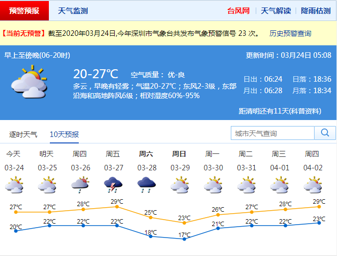 見圳客戶端·深圳新聞網(wǎng)2020年3月23日訊 深圳今天多云,早晚有輕霧;氣溫20-27℃;東風2-3級,東部沿海和高地陣風6級;相對濕度60%-95%。