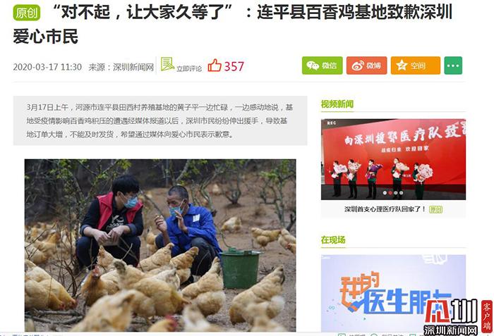 深圳新聞網(wǎng)愛心助農(nóng)的報道推出后,得到深圳各界和愛心市民的踴躍參與,大家紛紛通過報道中公布的微店訂購愛心雞。突然猛增的訂單,讓連平農(nóng)民感動的同時,也倍感壓力,因為百香雞都是現(xiàn)殺現(xiàn)寄,全程冷鏈配送,所以導(dǎo)致有些訂單滯后。3月17日,連平農(nóng)戶還通過深圳新聞網(wǎng)向深圳愛心市民發(fā)出致歉信--《“對不起,讓大家久等了”:連平縣百香雞基地致歉深圳愛心市民》,通過深圳新聞網(wǎng)向深圳愛心市民表示謝意的同時,又表達歉意。