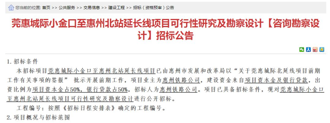 公告顯示,莞惠城際小金口至惠州北站延長(zhǎng)線正進(jìn)行可行性研究及勘察設(shè)計(jì)招標(biāo),招標(biāo)金額為7452.47萬(wàn)元(含稅價(jià))。