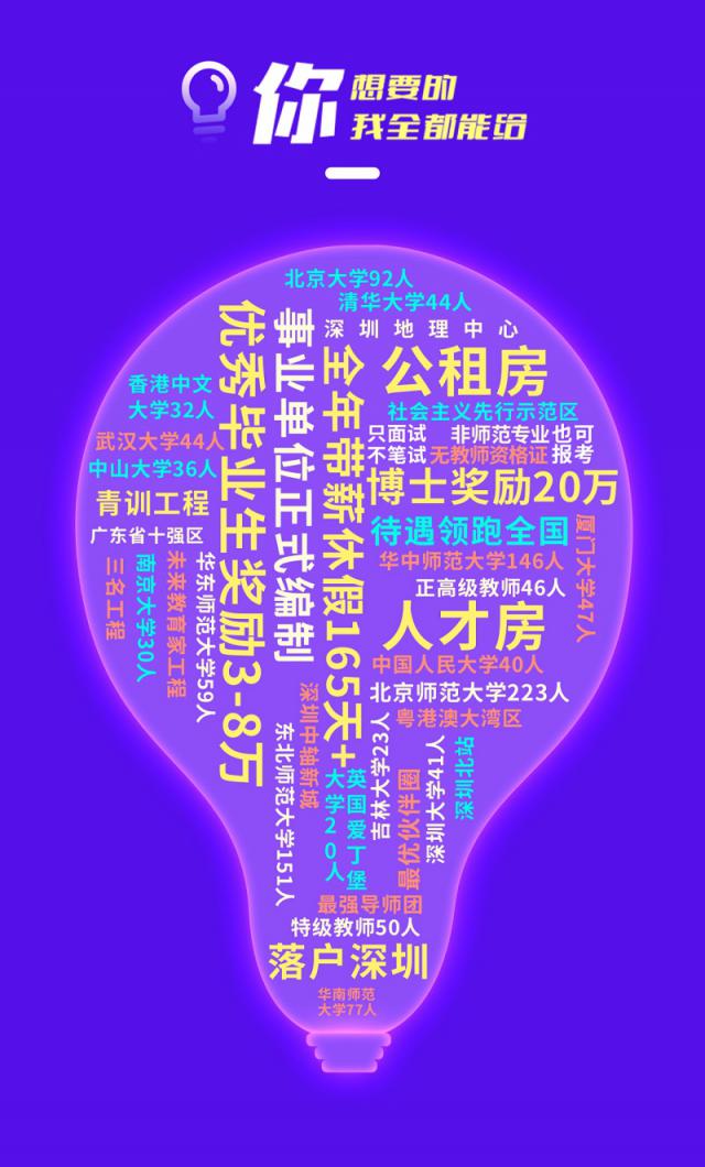 記者了解到,本輪招聘采取只面試、不筆試方式,非師范專(zhuān)業(yè)、無(wú)教師資格證者也可報(bào)考。一經(jīng)錄用,應(yīng)聘者可享受事業(yè)單位正式編制、落戶深圳、人才房、公租房、全年帶薪休假165天等待遇。其中,優(yōu)秀畢業(yè)生還將享受3萬(wàn) -8萬(wàn)元獎(jiǎng)勵(lì),博士研究生享受20萬(wàn)元獎(jiǎng)勵(lì),待遇領(lǐng)跑全國(guó)。