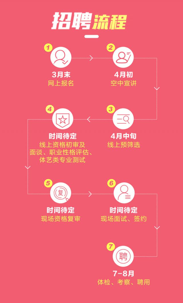 據(jù)悉,此次招聘將于3月末啟動(dòng)網(wǎng)上報(bào)名,4月初進(jìn)行"空中"宣講,4月中旬進(jìn)行線上預(yù)篩選,此后還將有線上資格初審及面談、職業(yè)性格評(píng)估、體藝類(lèi)專(zhuān)業(yè)測(cè)試、現(xiàn)場(chǎng)資格復(fù)審等環(huán)節(jié),錄用者將于7至8月進(jìn)行體檢、考察聘用。