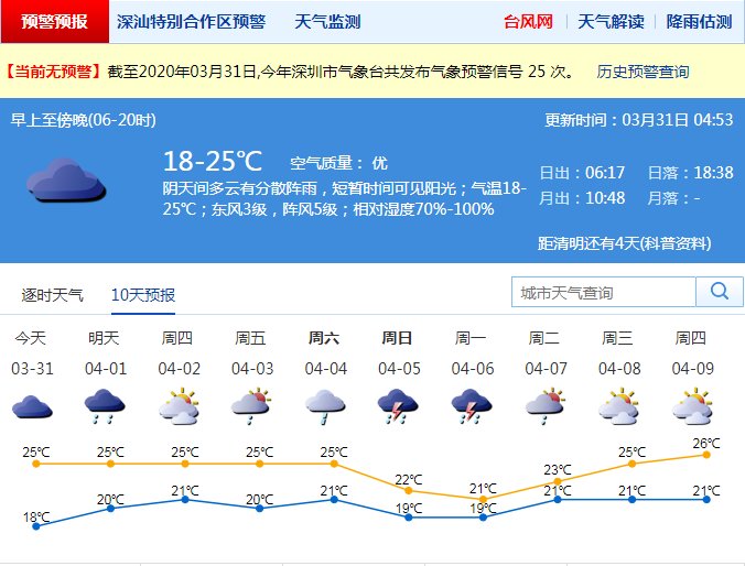 見圳客戶端·深圳新聞網(wǎng)2020年3月31日訊 31日陰天間多云,有零星小雨和輕霧,氣溫19-25℃;1日至4月3日多云到陰天,部分時(shí)間有分散小雨和輕霧;4-6日有一次明顯降雨過程。