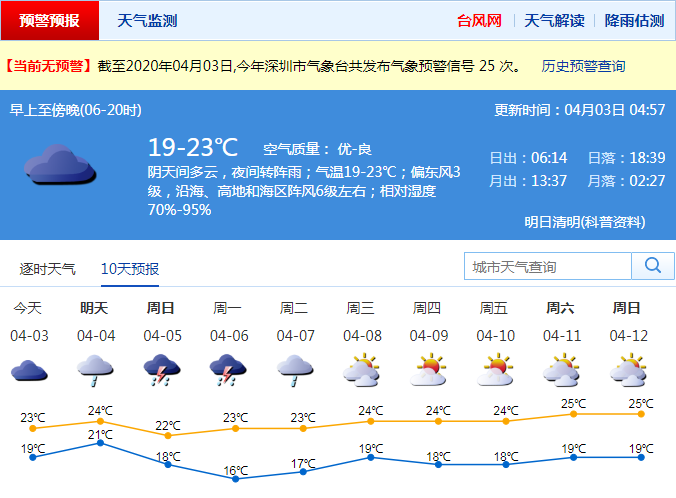 見圳客戶端·深圳新聞網(wǎng)2020年4月3日訊 深圳今日陰天間多云,夜間轉(zhuǎn)陣雨;氣溫21-23℃;偏東風(fēng)3級(jí),沿海、高地和海區(qū)陣風(fēng)6級(jí)左右;相對(duì)濕度70%-95%。清明假期4-6日有一次明顯降雨過程,并伴有雷暴,氣溫下降,其中4日有(雷)陣雨,5-6日有中到大雨局部暴雨;7日降雨減弱,轉(zhuǎn)多云。