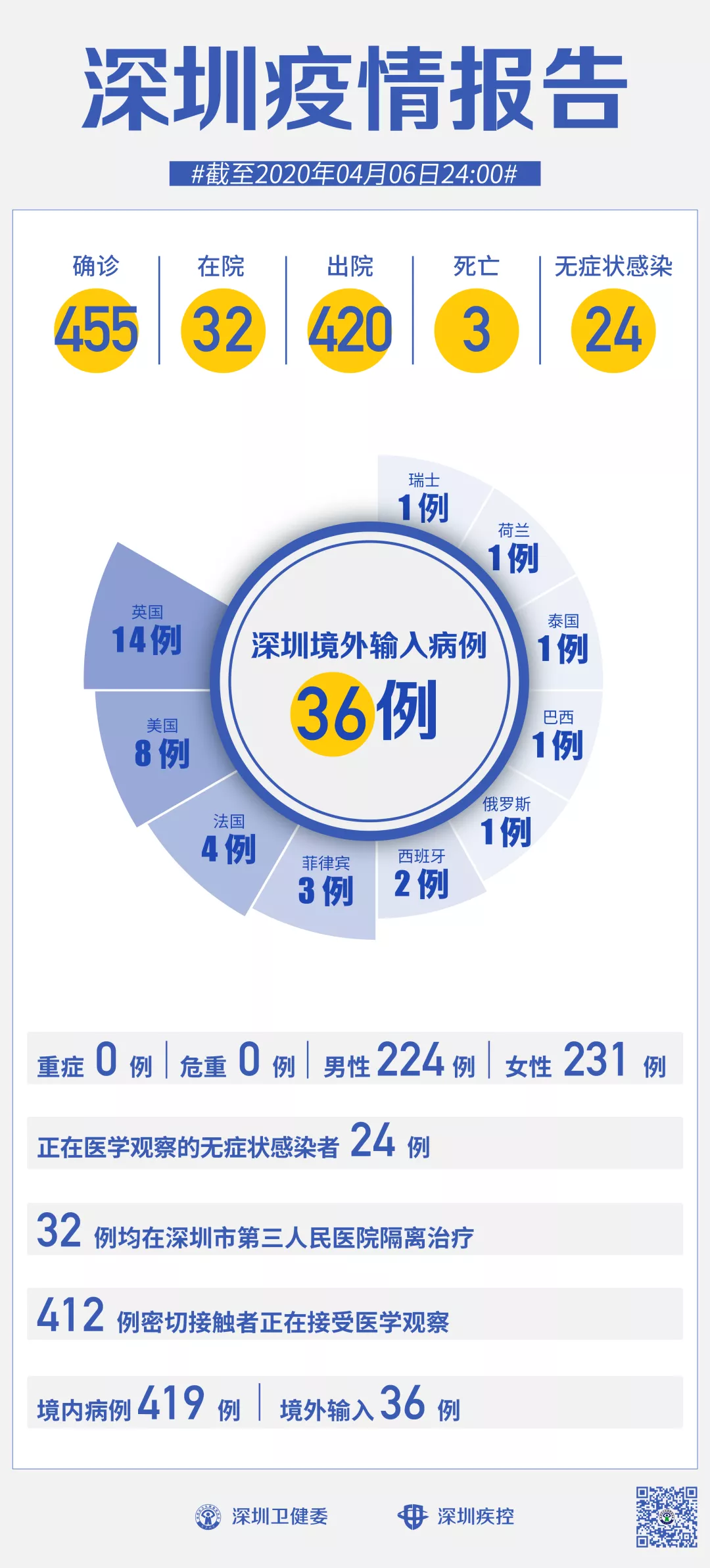截至4月6日24時(shí),深圳累計(jì)報(bào)告新冠肺炎病例455例。4月6日當(dāng)天新增無(wú)癥狀感染者1例。