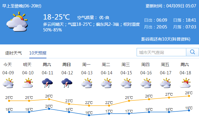 9-10日多云間晴天,氣溫回升;11日午后轉(zhuǎn)雷雨天氣,并伴有短時(shí)大風(fēng);12-13日冷空氣影響,氣溫下降3-4℃;展望14-16日多云天氣為主,氣溫逐日回升。
