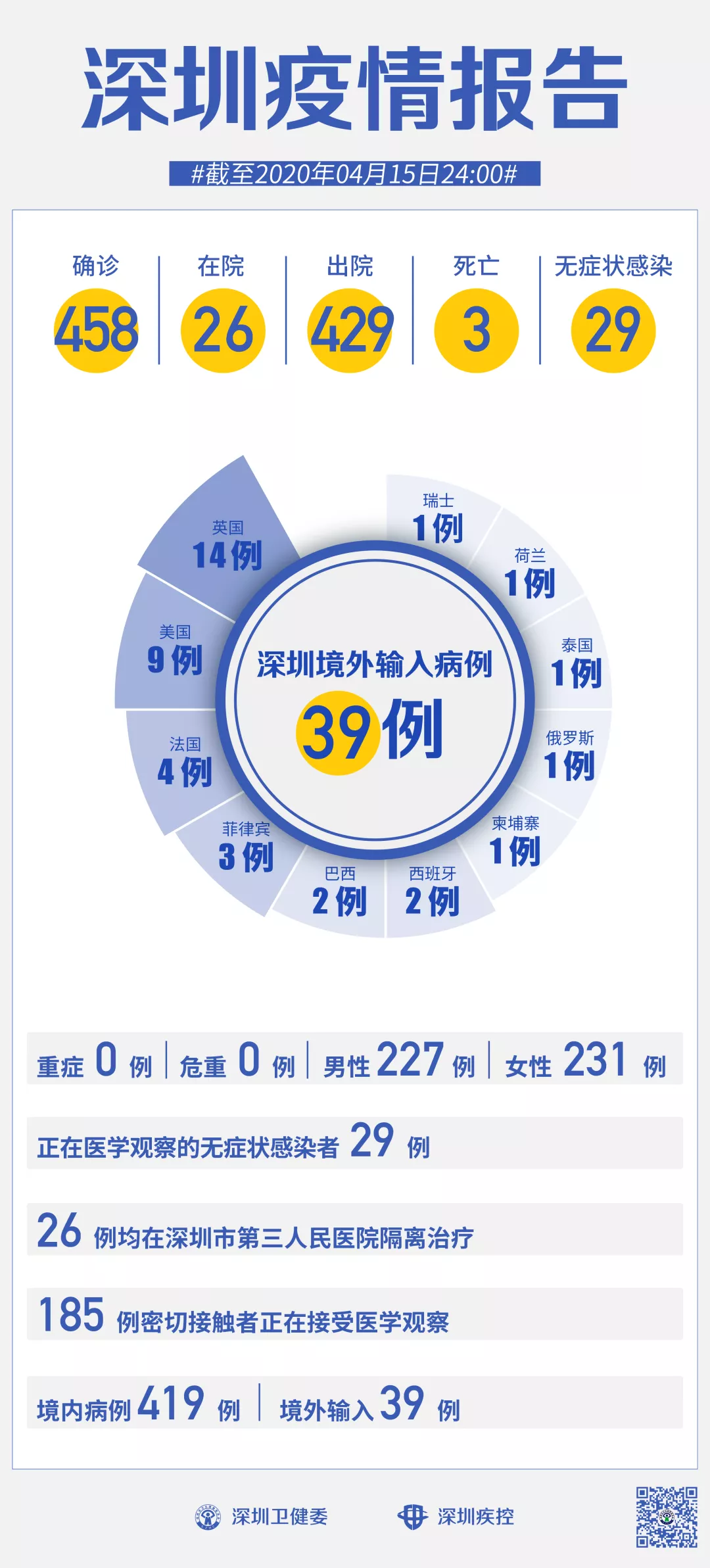 截至4月15日24時(shí),深圳累計(jì)報(bào)告新冠肺炎病例458例。4月15日當(dāng)天新增出院2例。