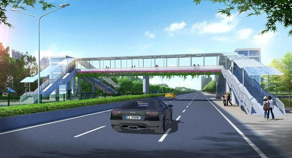 跨越南山區(qū)沙河西路,西接大沖片區(qū),東接沙河西生態(tài)長廊,橋長約113米,橋面凈寬約4.3米,主橋共4跨。天橋設計容景觀、造型、燈光、周邊環(huán)境于一體,設置無障礙觀光電梯,采用鋼箱梁及花崗巖面磚鋪裝、綠化自動滴灌等。天橋的建設將大大縮短居民繞行時間,對完善周邊居民出行環(huán)境具有重要意義。