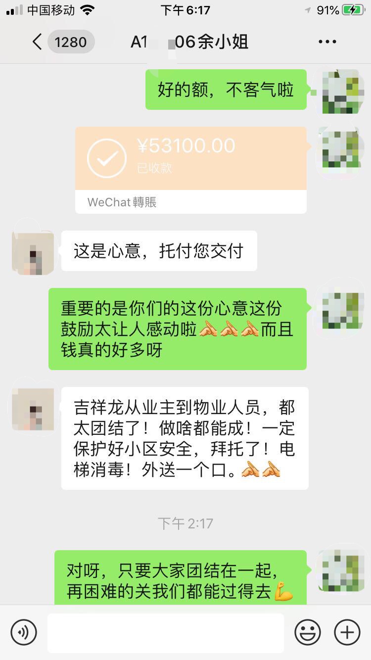 “張經(jīng)理,這是156戶業(yè)主的愛心捐款,支持咱們小區(qū)一線人員,是大家的一點(diǎn)心意!希望疫情早點(diǎn)過去。保護(hù)好我們的家園,你們都辛苦了!”2月9日,華潤物業(yè)吉祥龍小區(qū)服務(wù)中心負(fù)責(zé)人張經(jīng)理在微信中收到了這條留言以及5萬余元的轉(zhuǎn)賬。