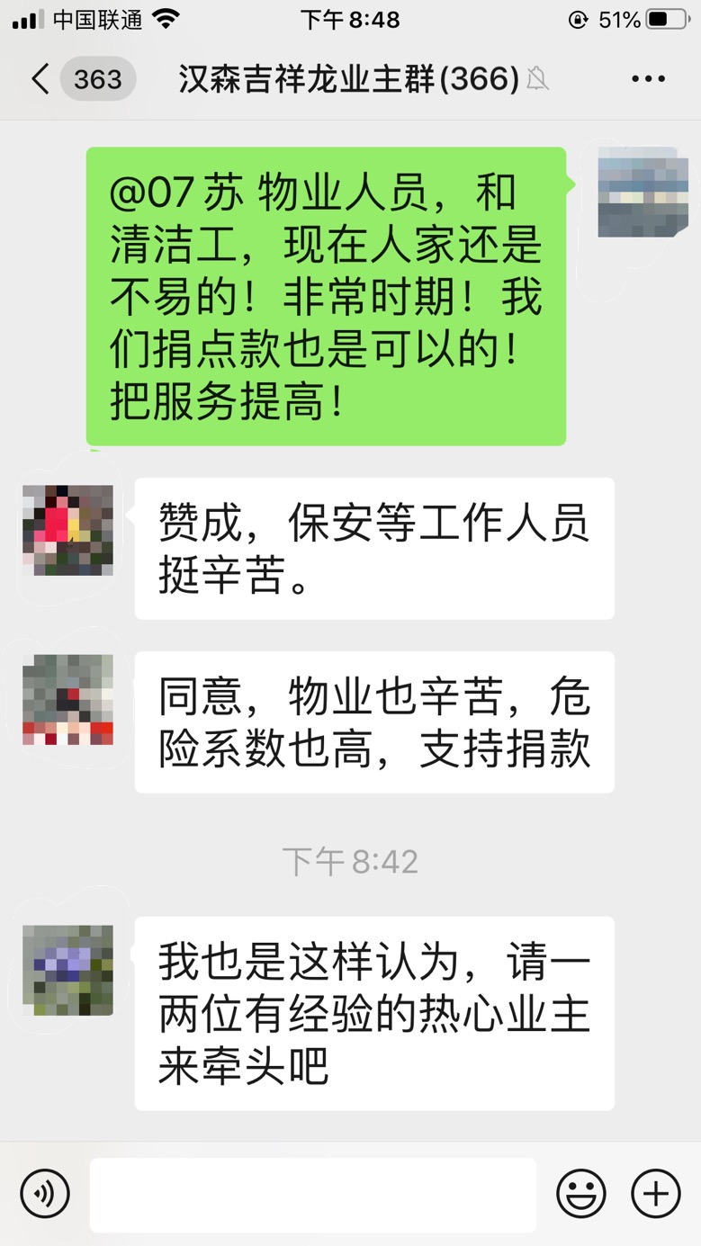 原來,吉祥龍小區(qū)業(yè)主因?yàn)橛X得物業(yè)一線工作人員抗戰(zhàn)疫情工作危險(xiǎn)又更辛苦,便在微信群內(nèi)發(fā)起了給本小區(qū)物業(yè)人員捐款的倡議,收到了眾多業(yè)主的熱烈反響?!百澇?,保安等工作人員挺辛苦”、“同意,物業(yè)也辛苦,危險(xiǎn)系數(shù)也高,支持捐款”……業(yè)主們通過討論,約定好捐贈(zèng)方式全憑自愿、不搞強(qiáng)制、不論數(shù)額、謹(jǐn)表心意。短短一小時(shí),捐贈(zèng)金額就達(dá)到了3萬余元。業(yè)主余小姐表示,吉祥龍小區(qū)業(yè)主和物業(yè)人員在防疫過程中正團(tuán)結(jié)一心、關(guān)系緊密,一定能保護(hù)好小區(qū)安全。