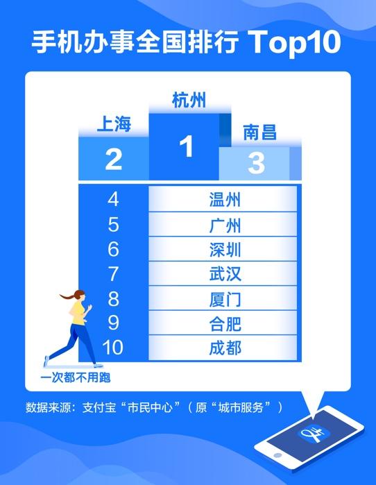 4月21日,支付寶“市民中心”發(fā)布的全國手機辦事排行榜顯示,已有超過300城的市民服務能在手機上完成。其中,杭州、上海、南昌等地的市民能在手機上辦的事最多。