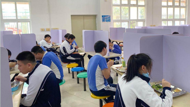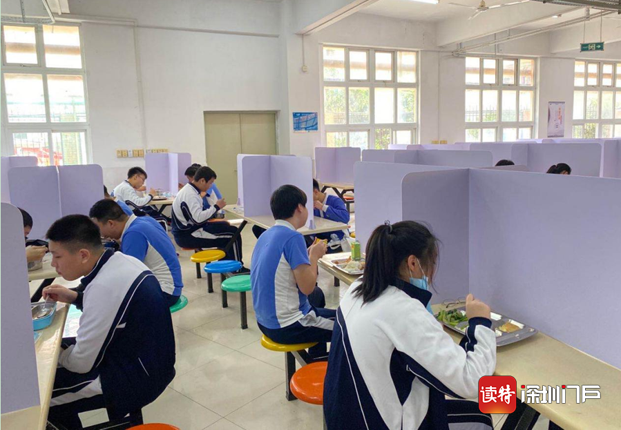 深圳特區(qū)報2020年4月27日訊 4月27日,深圳高三、初三學子返校。食堂是校園防控工作的重點,中午時分,學生就餐開始,實行錯峰就餐、分區(qū)就餐。有的學校將每張餐桌用有機玻璃隔板分隔用餐區(qū)域,有的學校在空間足夠的條件下實行單人單桌,按號就座。