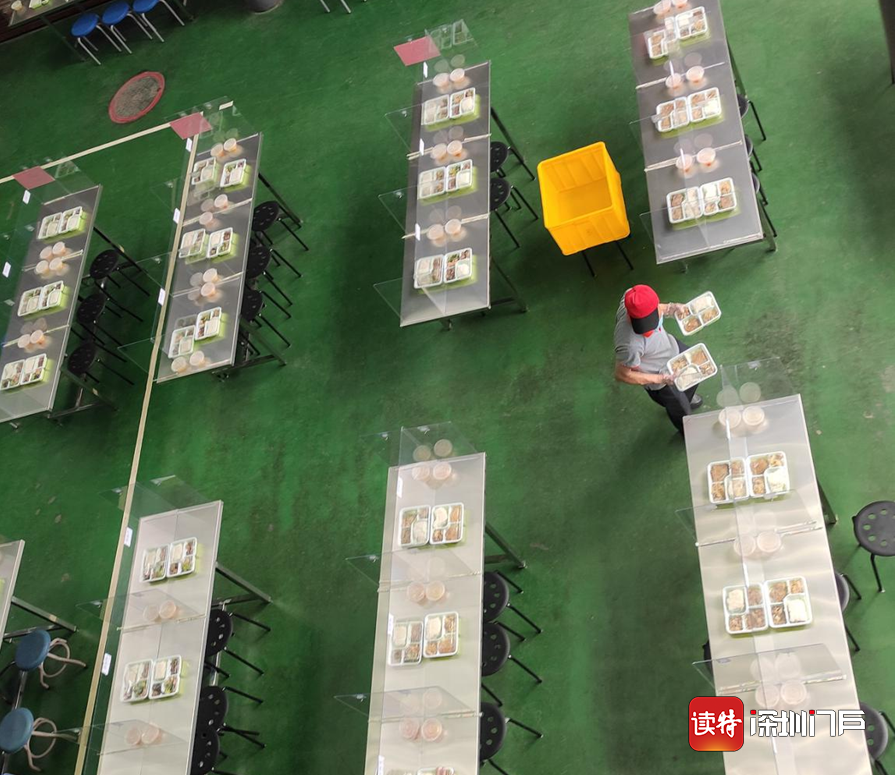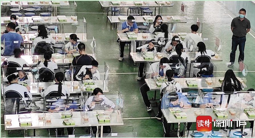 梅林中學(xué)的學(xué)生分批開始了午餐。在用餐前,餐廳服務(wù)人員將飯盒一一放在桌子上。學(xué)生坐下后可直接用餐,不得交談,桌子中間設(shè)置了隔擋。