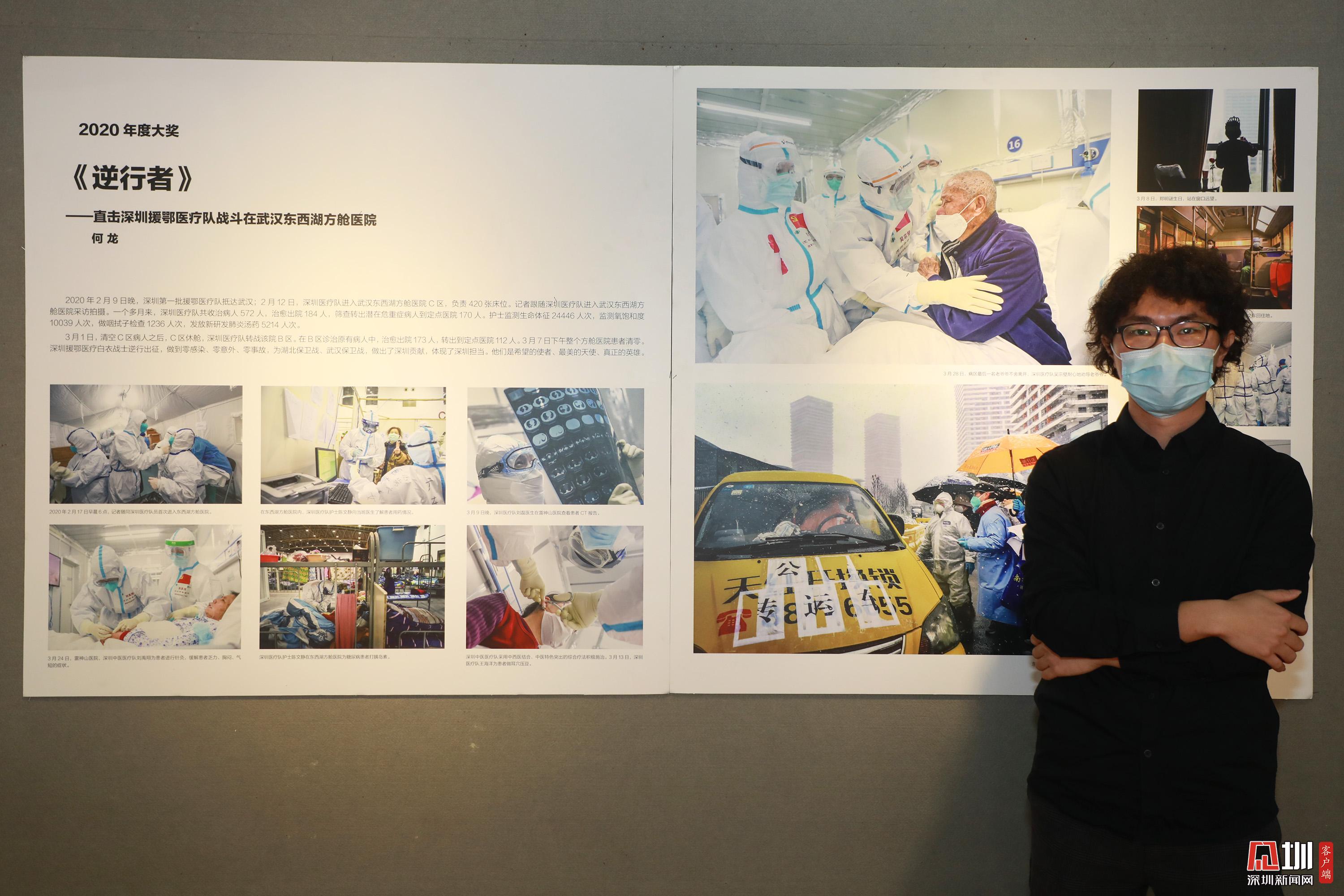 何龍站在自己的攝影作品《逆行者》前
