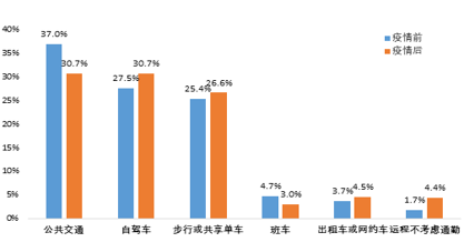 調(diào)查顯示,市民選擇公共交通方式的比例從疫情前的約37%下降至約30%,選擇私人小汽車的從27.5%上升至30.7%,選擇步行、自行車等慢行方式的從25.4%上升至接近27%。疫情過后,市民出行選擇公共交通的比例有所下降,小汽車和風(fēng)險(xiǎn)更低,更私密、更獨(dú)立的慢行交通方式成為偏好選擇。