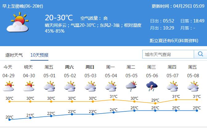見圳客戶端·深圳新聞網(wǎng)2020年4月29日訊 29日氣溫20-30℃,晴天間多云;東風2-3級,相對濕度45%-85%。展望五一假期期間(1-5日)天氣總體平穩(wěn),多云間陰天,早晚有輕霧,間中有短時陣雨。