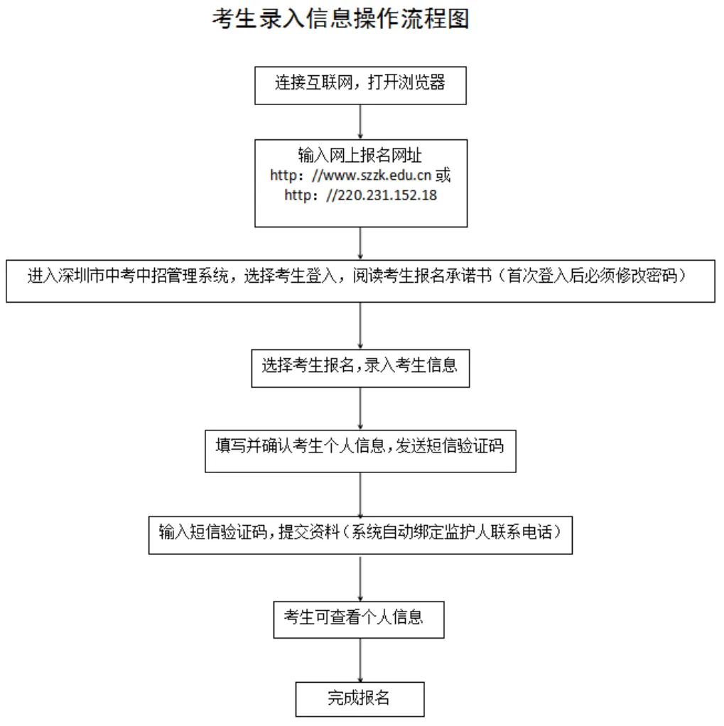 社會類考生采用網(wǎng)上報(bào)名方式進(jìn)行報(bào)名。報(bào)名考生需在5月6日至15日登錄報(bào)名網(wǎng)址(http://www.szzk.edu.cn/),按照提示進(jìn)行網(wǎng)上注冊,上傳報(bào)名審核資料,由考生戶籍所在區(qū)社會報(bào)名點(diǎn)進(jìn)行線上審核,審核通過后系統(tǒng)將生成中考考生號及初始密碼,考生需用獲取的考號及密碼登錄中考中招管理系統(tǒng),填寫個(gè)人信息,具體操作可參考“考生錄入信息流程圖”。同時(shí)需在報(bào)名截止前根據(jù)指引完成網(wǎng)上繳費(fèi)。