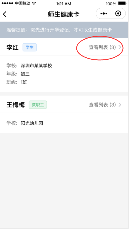 在開學(xué)專區(qū)點擊“師生健康卡信息”,然后點擊“查看列表”,可查看您的健康申報記錄,點擊“重新生成健康卡”進行更新。