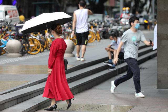 ▲走在街上,熱浪撲面而來(lái),耀眼的陽(yáng)光把人曬得睜不開(kāi)眼,行人紛紛拿起手頭物品遮擋烈日。