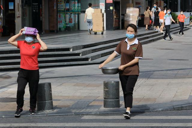 ▲走在街上,熱浪撲面而來,耀眼的陽光把人曬得睜不開眼,行人紛紛拿起手頭物品遮擋烈日。