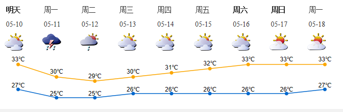 5月9日多云間晴天,局部有短時陣雨,氣溫27-32℃,中北部和人口密集區(qū)33-34℃;