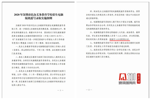圖為深圳市民辦義務(wù)教育學校招生電腦隨機搖號錄取實施細則頁面截圖。
