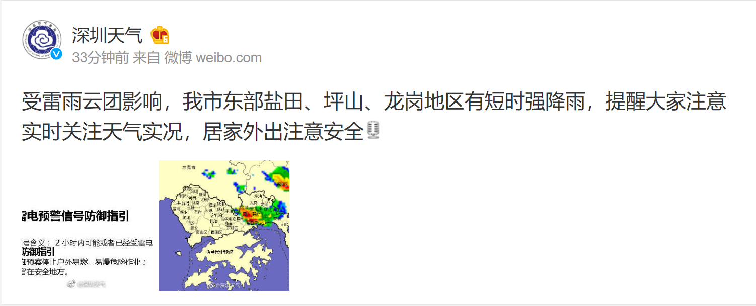據(jù)@深圳天氣消息,目前廣東多地出現(xiàn)分散雷雨天氣,預(yù)計今天下午到夜間深圳天氣不穩(wěn)定,有雷雨,局部可達(dá)大雨,請大家做好防御措施,出門備好雨具,持續(xù)關(guān)注深圳天氣發(fā)布的最新預(yù)報信息。