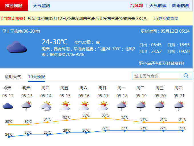 見(jiàn)圳客戶端·深圳新聞網(wǎng)2020年5月12日訊 深圳昨夜雷電+大風(fēng)黃色+暴雨黃色預(yù)警齊生效,市氣象臺(tái)于2020年05月11日23時(shí)30分在全市取消暴雨黃色、大風(fēng)黃色預(yù)警。預(yù)計(jì)12日白天多云間陰天,有陣雨。13日陣雨轉(zhuǎn)多云,天況逐漸轉(zhuǎn)好,14-17日多云為主,陽(yáng)光充足,天氣再趨炎熱。