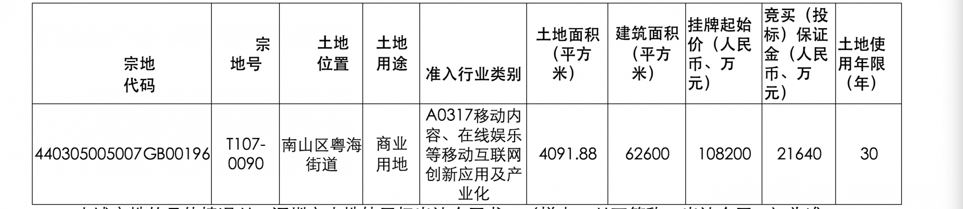 根據公告,T107-0090宗地位于南山區(qū)粵海街道創(chuàng)業(yè)路,后海河畔,土地用途為商業(yè)用地,準入類別為A0317移動內容、在線娛樂等移動互聯網創(chuàng)新應用及產業(yè)化,土地面積4091.88平方米,建筑面積62600平方米,容積率:≤15.3,掛牌起始價108200萬元,土地使用年限30年。掛牌期自2020年6月3日起至2020年6月12日15時止。