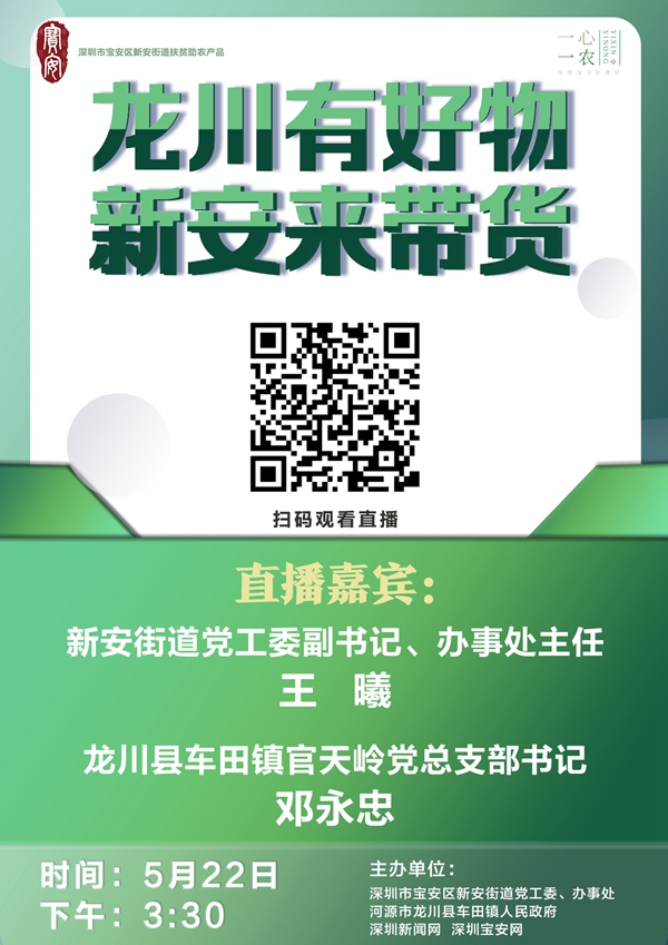5月22日下午3:30,新安街道黨工委副書記、辦事處主任王曦、龍川縣車田鎮(zhèn)官天嶺村支部書記鄧永忠還將作客深圳新聞網(wǎng)直播間,向網(wǎng)友推介綠殼雞蛋、黑豆腐竹、生態(tài)米、牛海花生等優(yōu)質(zhì)農(nóng)產(chǎn)品,通過電商打通貧困村農(nóng)產(chǎn)品銷售渠道。歡迎觀看,不見不散!