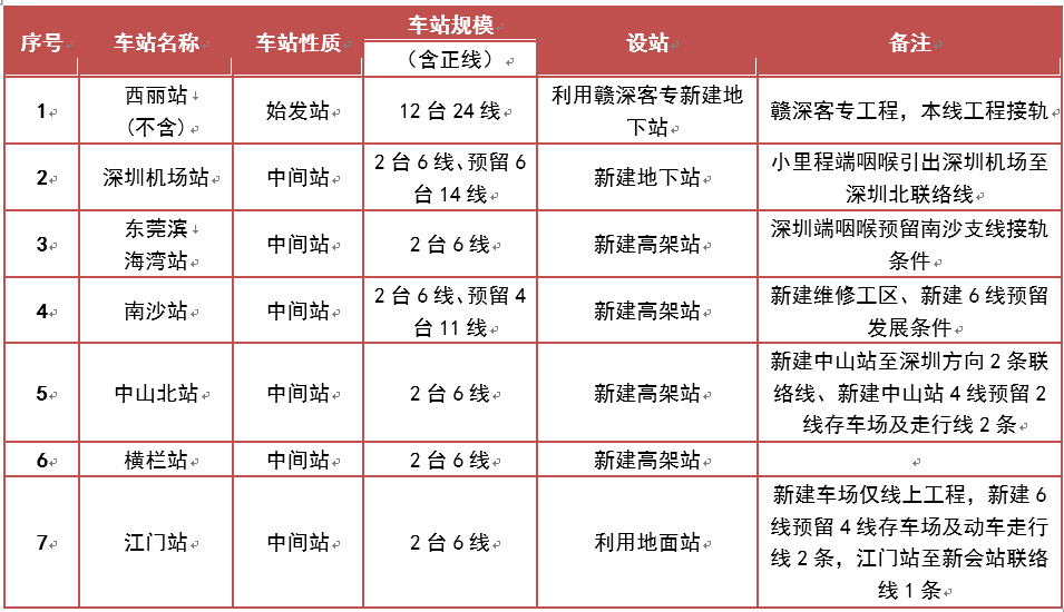 項目共設西麗(不含)、深圳機場、濱海灣、南沙、中山北、橫欄、江門等7個車站,其中西麗、深圳機場為地下站,濱海灣、南沙、中山北、橫欄為高架站,江門站為地面站。