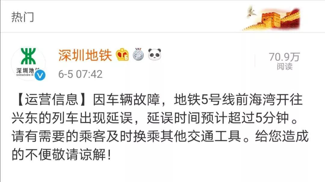 見圳客戶端·深圳新聞網(wǎng)2020年6月5日訊 今早7點42分深圳地鐵官方微博發(fā)布公告:因車輛故障,地鐵5號線前海灣開往興東的列車出現(xiàn)延誤,延誤時間預(yù)計超過5分鐘。
