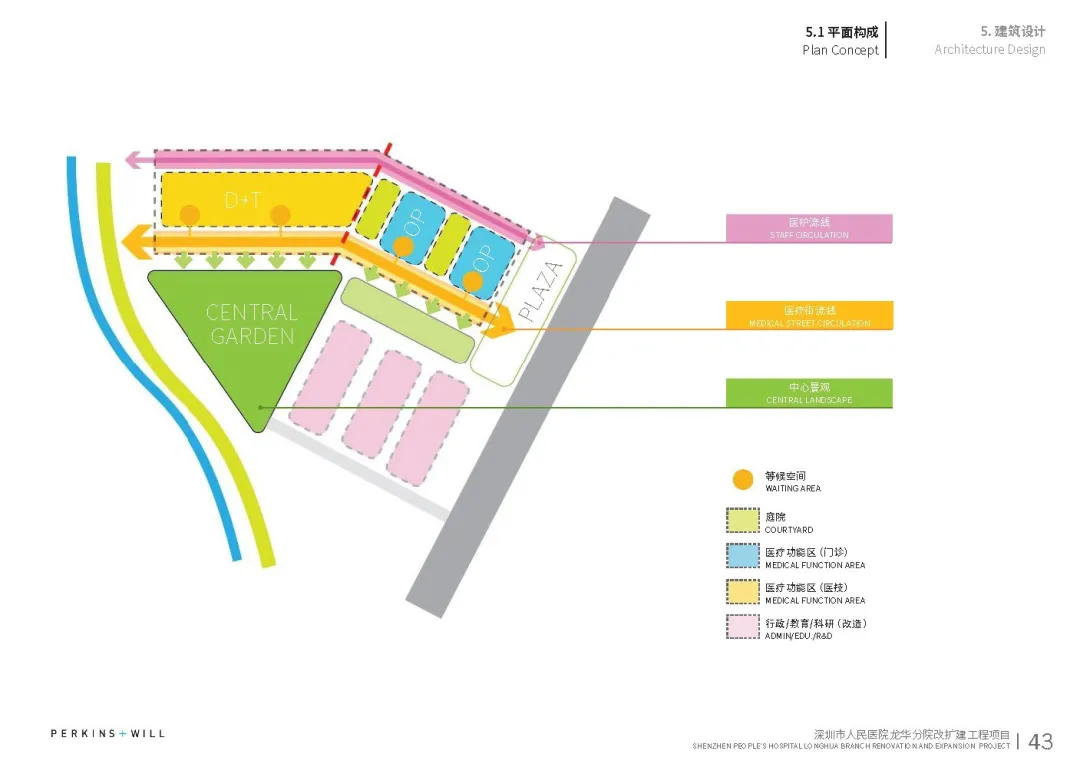 醫(yī)療街沿中央花園布置,一側設置醫(yī)療功能及各等候空間,同時也貫穿一、二期的建設。
