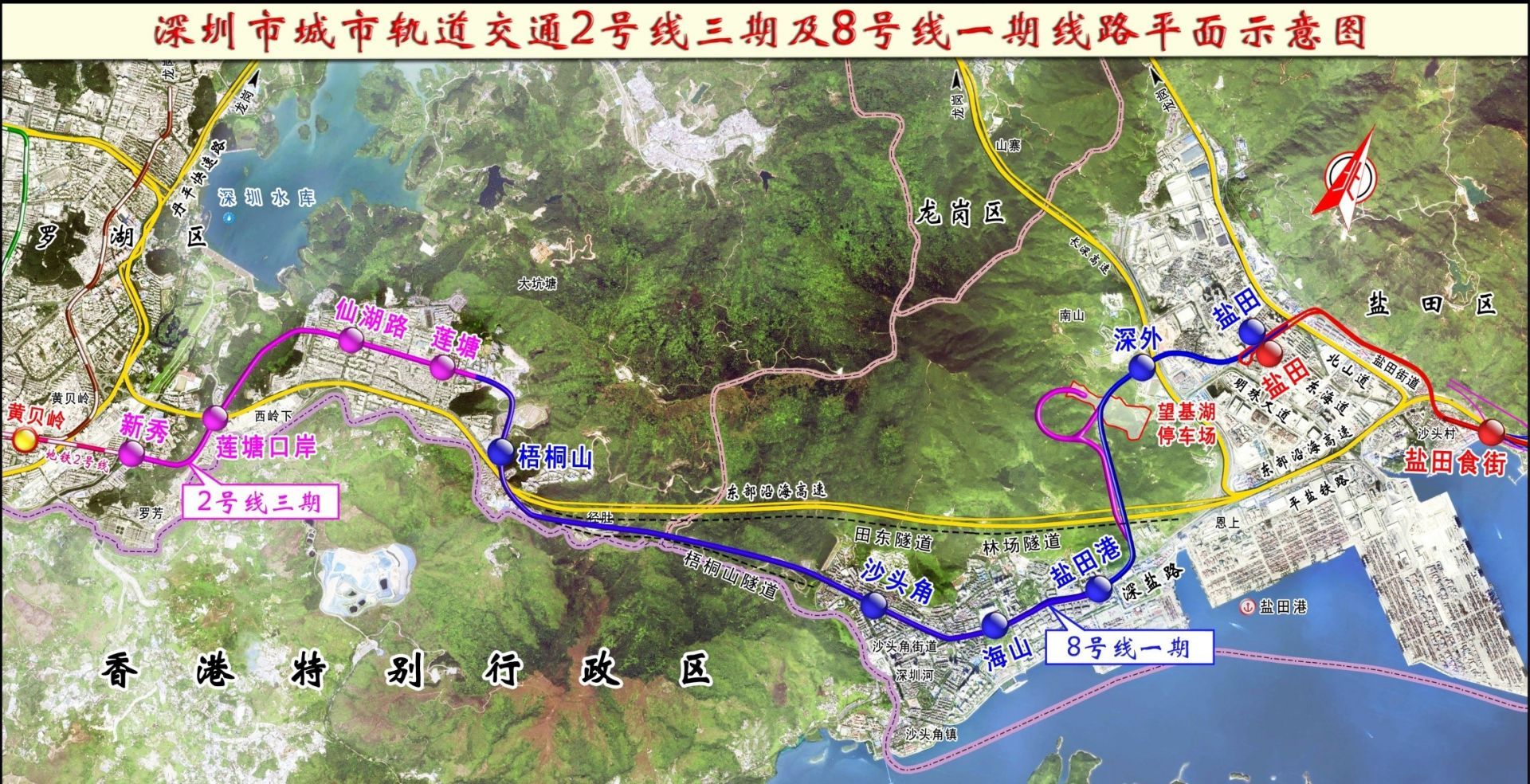 8號(hào)線一期工程由2號(hào)線三期工程蓮塘站站后折返線接出,起于梧桐山南站,終點(diǎn)為鹽田路站,后接包含大梅沙站、小梅沙站的8號(hào)線二期工程(在建),線路全長12.34km,包含6站及6區(qū)間。