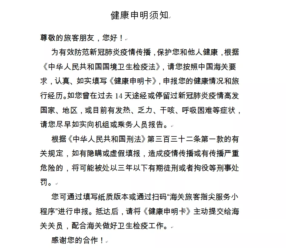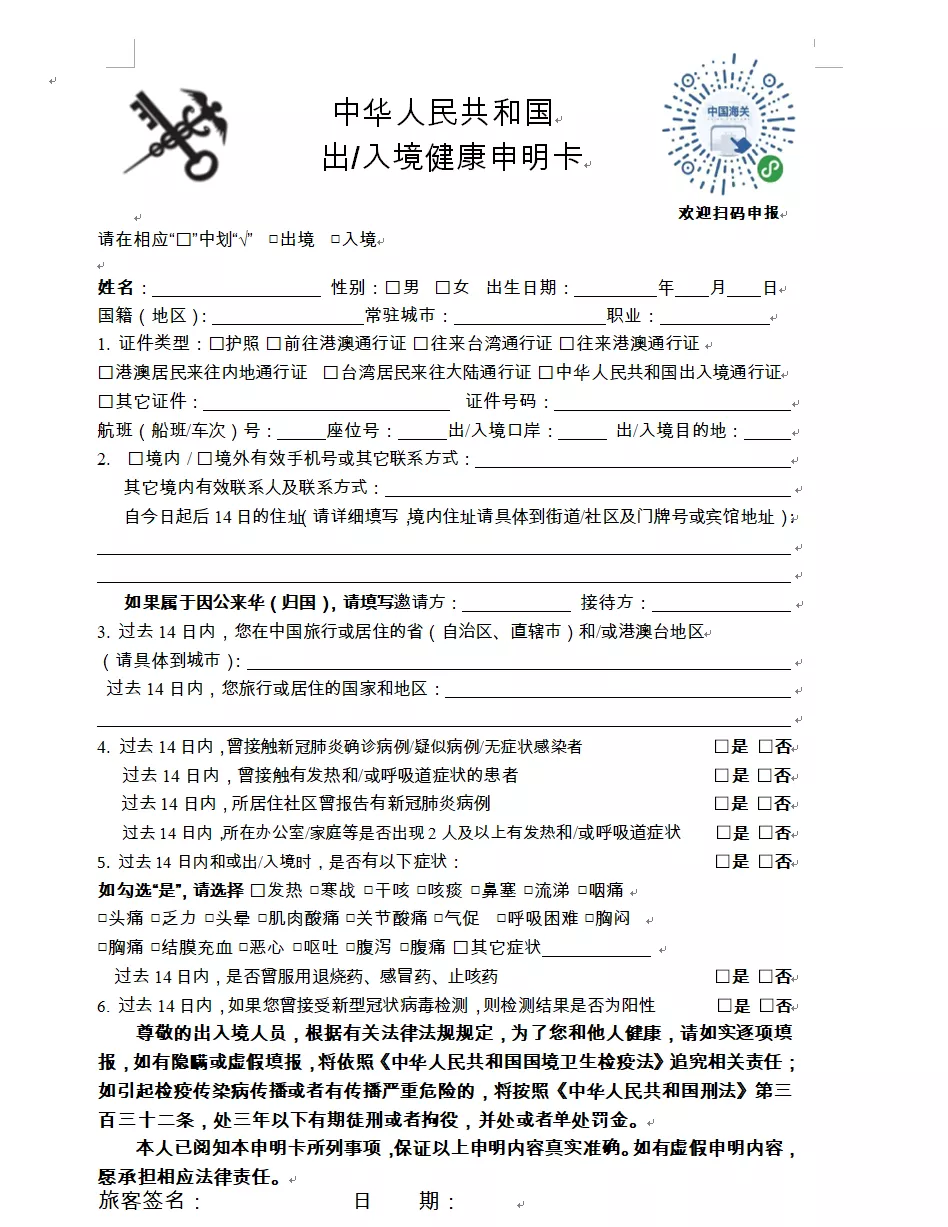 一、請?zhí)崆跋螺d打印《健康申明卡》(見附件1),或關(guān)注“海關(guān)旅客指尖服務(wù)小程序”(見附件2)。提前如實(shí)填寫紙質(zhì)或電子健康申報信息,通關(guān)時主動向海關(guān)申報。