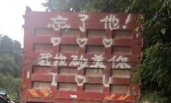 近日,貴陽一30歲貨車司機為了表達妻子和自己一起拉砂相濡以沫的感情,趁著十五天的臨牌期,效仿網(wǎng)絡(luò)短視頻,用白色自噴漆在車身上噴涂了“忘了他,我拉砂養(yǎng)你”的標語。
