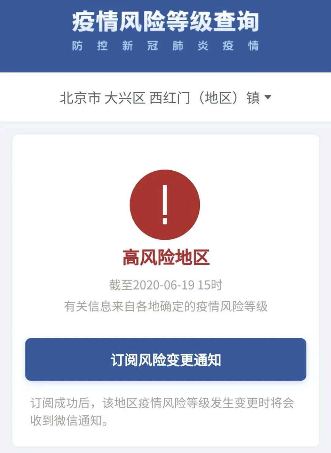 截至6月19日15時,北京大興西紅門(地區(qū))鎮(zhèn)從中風(fēng)險地區(qū)升級為高風(fēng)險地區(qū)。