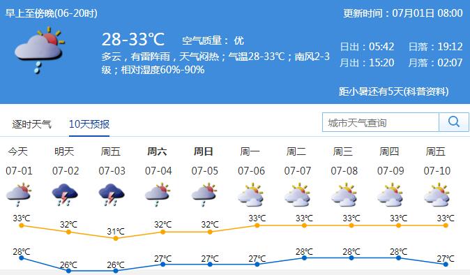 見圳客戶端·深圳新聞網2020年7月1日訊 我市今日晴天間多云,局地有短時(雷)陣雨;氣溫28-33℃,中北部及人口密集區(qū)最高氣溫可達35℃以上;偏南風2-3級;相對濕度60%-90%。