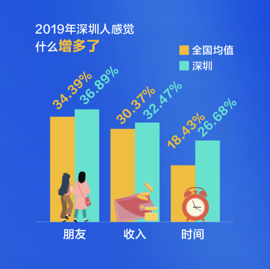 深圳人比較關(guān)注健康,不管是宅在家還是外出娛樂,他們選擇運(yùn)動健身的比例都超過全國平均水平,對健康的投資,成就了又一個(gè)“苗條之城”。過去這一年,有四成的深圳人感覺自已“輕松”了,體重減少的人群比例高出全國近14個(gè)百分點(diǎn)。甩掉了贅肉的同時(shí),深圳人還感覺在時(shí)間、朋友、收入這三方面的收獲在增加。尤其是時(shí)間,超出了全國均值8個(gè)百分點(diǎn)。