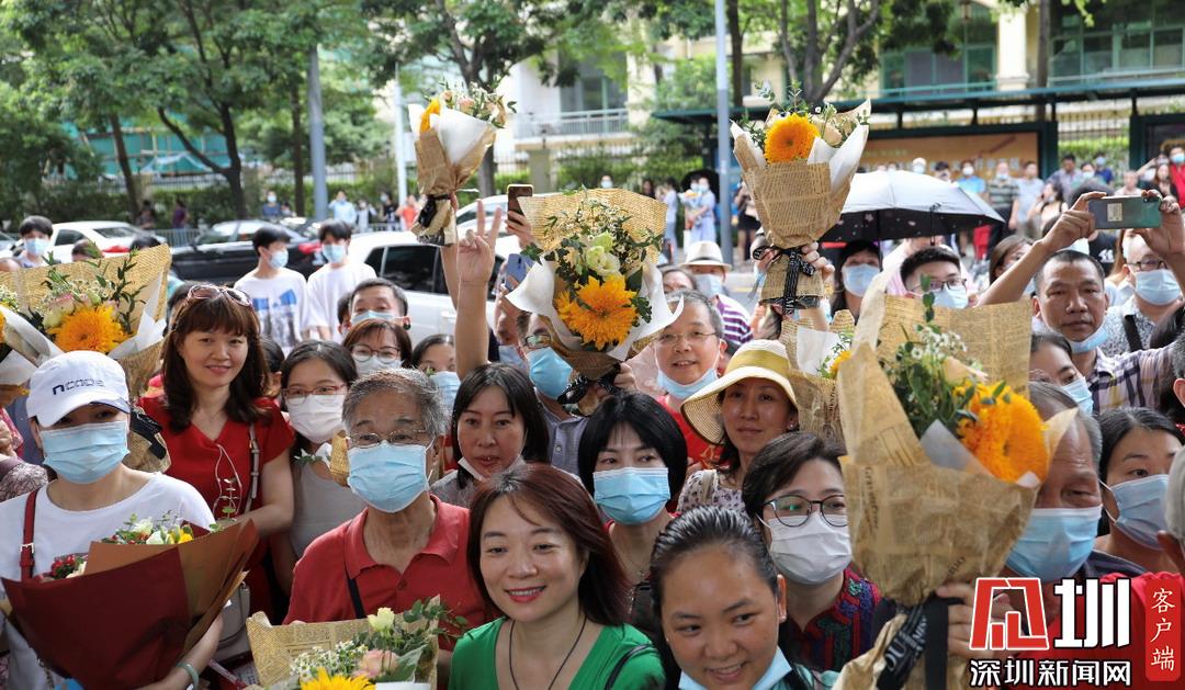 深圳高級(jí)中學(xué)考點(diǎn)外家長(zhǎng)受捧鮮花、滿(mǎn)懷期待。