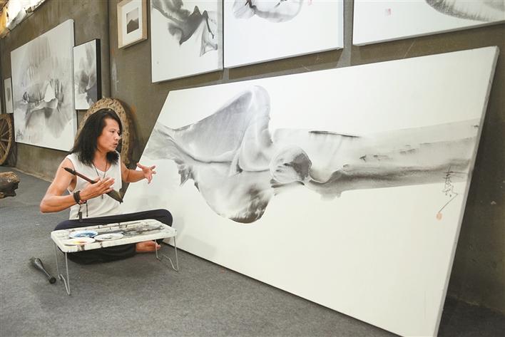 凌晨3點(diǎn),梧桐山腳下一間低矮樓房房頂?shù)漠嬍掖翱诹疗鹞⑷醯臓T光。鄭泰均開始烹茶研墨,茶香裊裊中,手中動(dòng)作不急不緩,任憑腦海中的靈感肆意飄散。不知不覺中,晨光從云層縫隙中泄下,山間的鳥鳴逐漸清晰,他走出畫室,在開闊的天地之間開始揮墨。