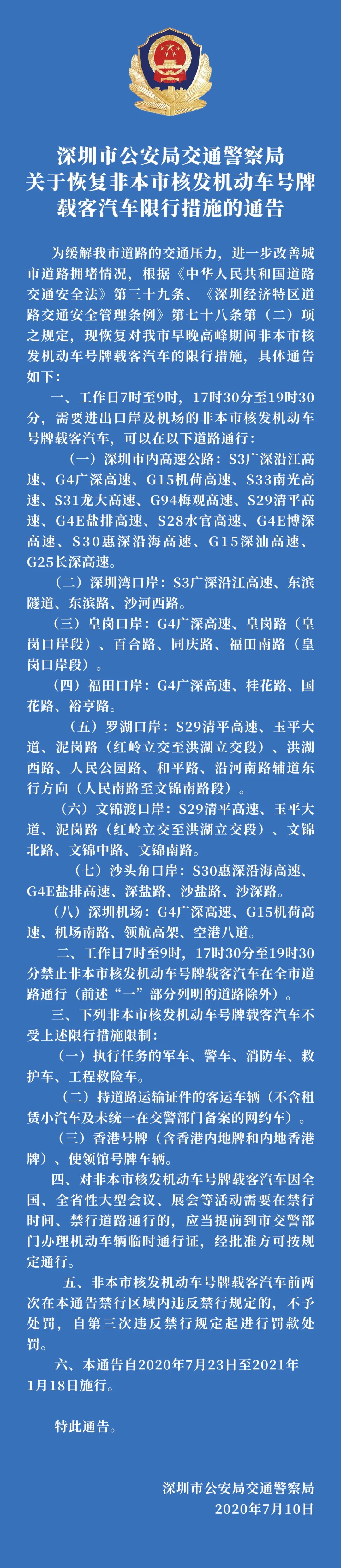 見(jiàn)圳客戶端?深圳新聞網(wǎng)2020年7月15日訊(見(jiàn)圳客戶端、深圳新聞網(wǎng)記者 張喆 陳彥如 實(shí)習(xí)生 廖章霖)7月15日,記者從深圳市交警支隊(duì)了解到,7月23日開(kāi)始深圳將恢復(fù)“限外令”,對(duì)非深號(hào)牌小型載客汽車恢復(fù)限行。本次“限外令”與此前保持一致,除全市高速公路和部分疏港通道不限行以外,全市所有道路在早7:00-9:00和晚17:30-19:30高峰時(shí)段對(duì)所有非深圳號(hào)牌載客汽車實(shí)施限行。