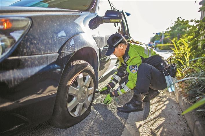 鐵騎民警在烈日下幫車主陳先生換輪胎。