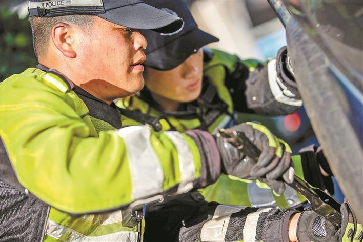 時云財和同事馬上幫助陳先生從車后備箱拿出換胎工具和備胎,在保證安全的前提下,僅用10分鐘就更換好輪胎。“太感謝你們了,深圳交警‘小黃人’真的是我們最信任的人,有你們在我覺得上路開車就很放心?!标愊壬蛔〉馗兄x、稱贊交警鐵騎小哥。