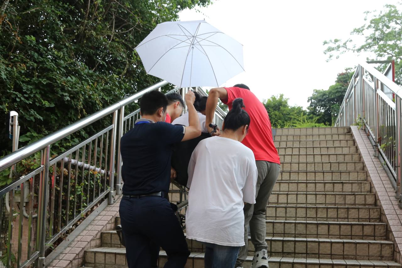 東升學(xué)??键c有一位行動不便的考生,學(xué)校派三名工作人員提前護送考生到考場。 (記者李麗