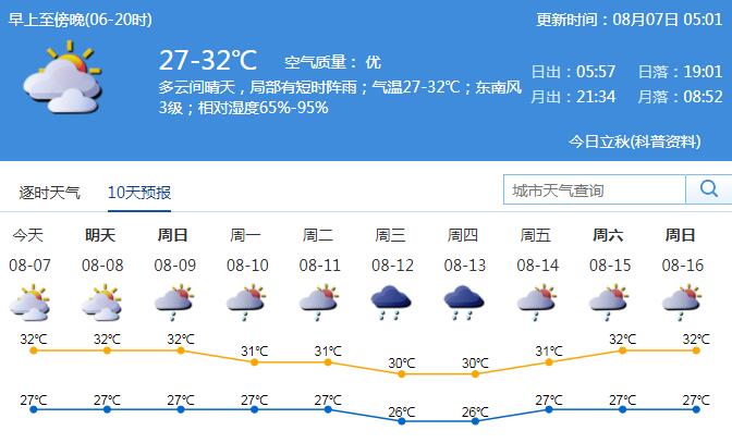 見圳客戶端·深圳新聞網(wǎng)2020年8月7日訊 降雨暫緩,高溫又卷土重來。8月7日白天,全市以多云天氣為主,偶有短時陣雨,早晚最低氣溫在27℃左右,中午前后最高氣溫在32℃左右,漸趨悶熱。市內(nèi)維持2-3級東南風;空氣濕度大,相對濕度65%-90%。
